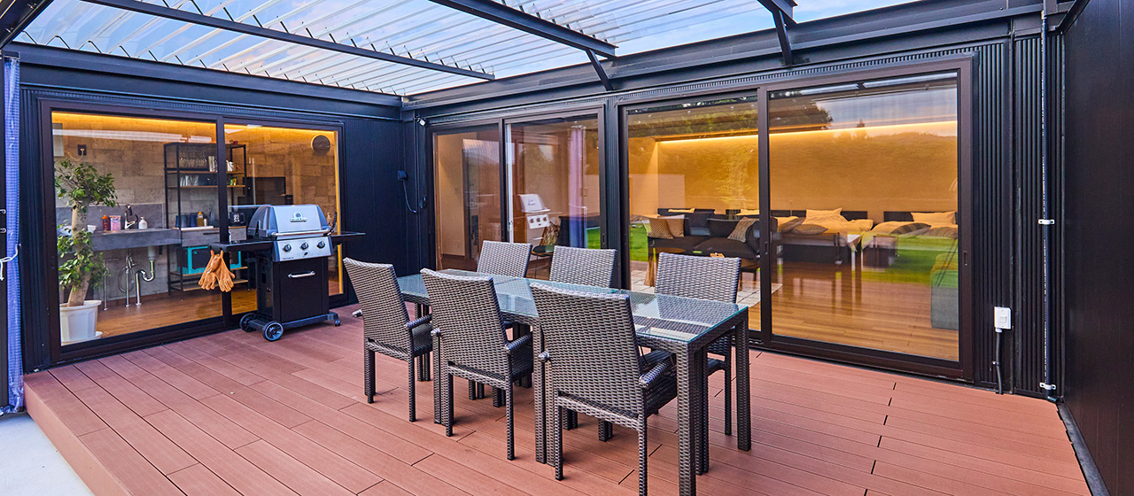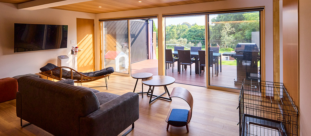 リビング兼寝室棟、キッチン棟、風呂棟どこにいても豊かな自然を身近に感じる開放感たっぷりの設え。爽快な開放感をお楽しみいただけます。