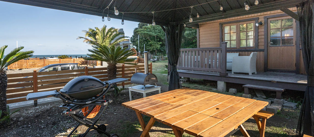 プライベートガーデンスペースには焚き火台を設置しており、晴れた日の夜は、焚き火体験をお楽しみいただけます。薪火独特の心地良い香りとリラクゼーション効果があると知られる揺らめく炎を囲み、潮騒をBGMに非日常体験をお過ごしください。