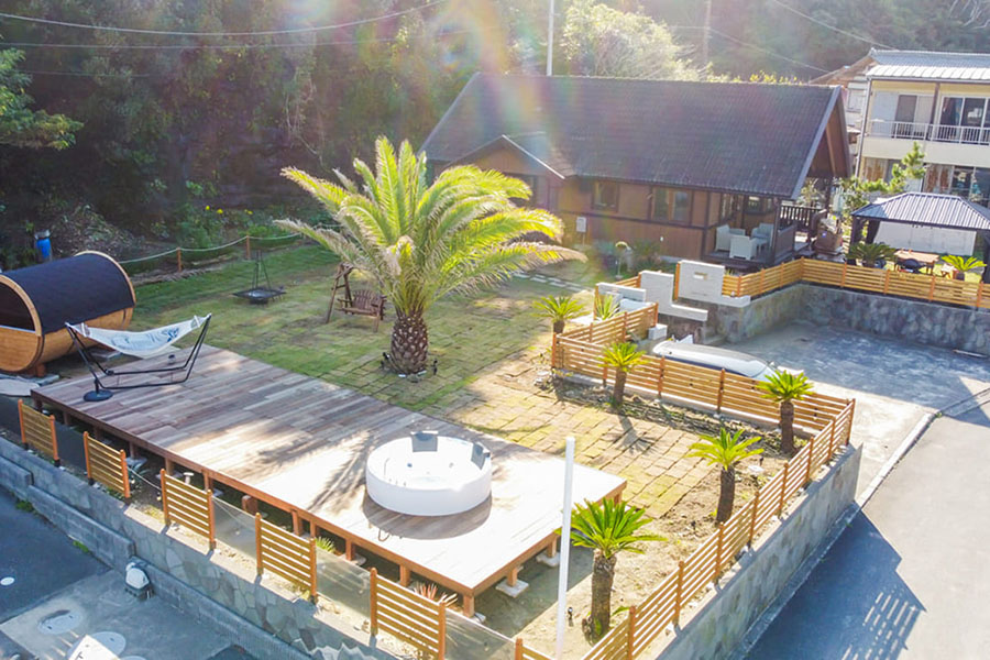 海を臨む広々としたプライベートガーデンは、全面にフェンスを設置しており、お客様だけのプライベートドッグランとしてご利用いただけます。 また、ドッグランや海で遊んだ後に使える温水屋外シャワーも設置しております。 バレルサウナ&ジャグジーも設置しておりますので、滞在中はいつでもお楽しみいただけます