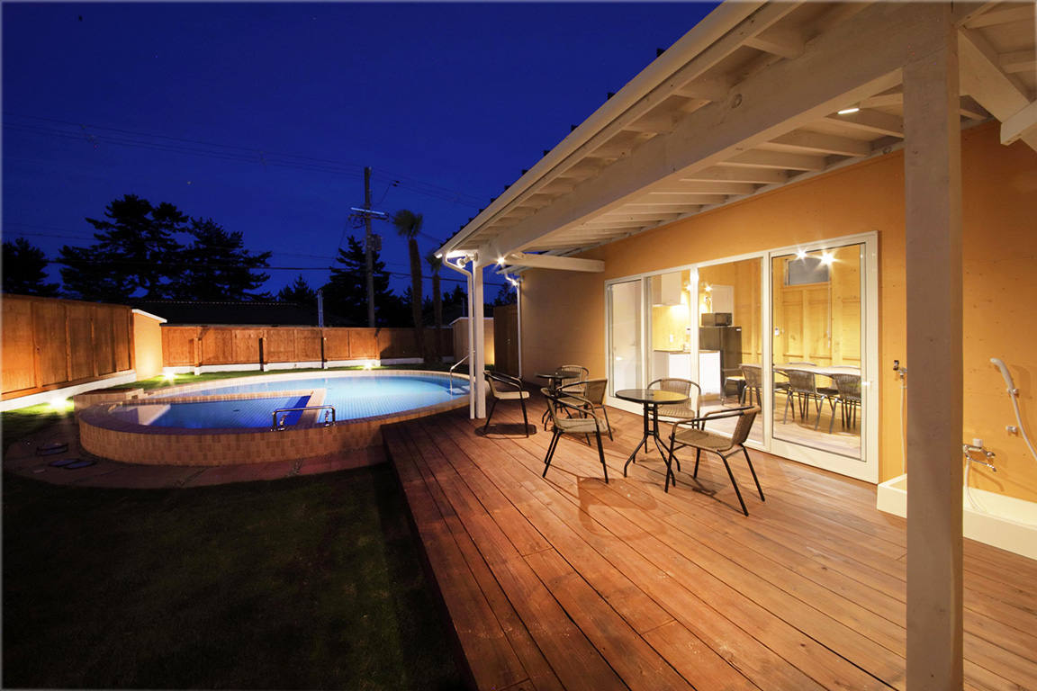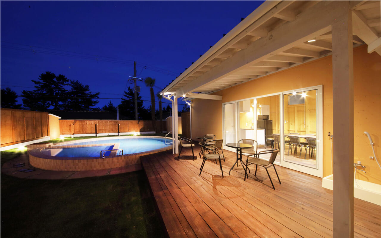 プライベートプール各棟のガーデンスペースには、プライベートプールを完備しております。わんちゃん専用エリアも設けております。※夏季(7月~9月)のみご利用いただけます。