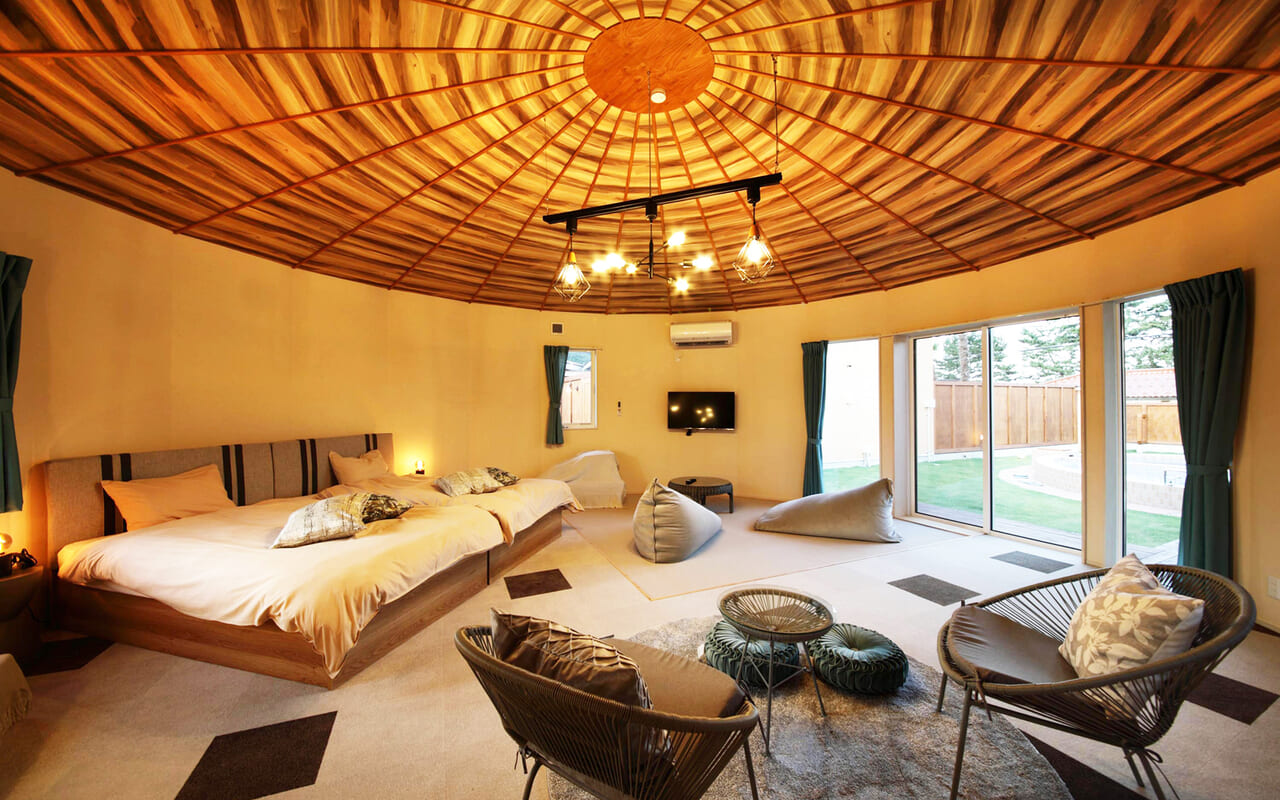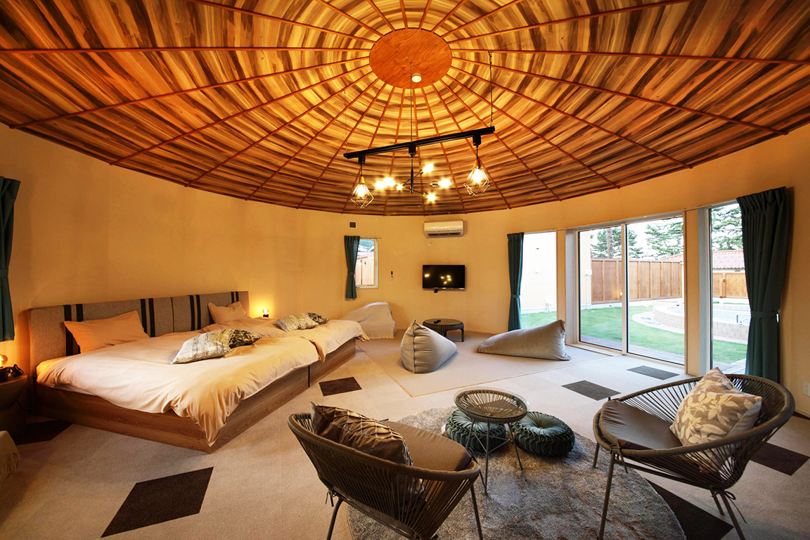 円形の独特な形状のヴィラタイプ。シングルベッド4台を設置し、ファミリー、グループでも使いやすいのが特徴です。