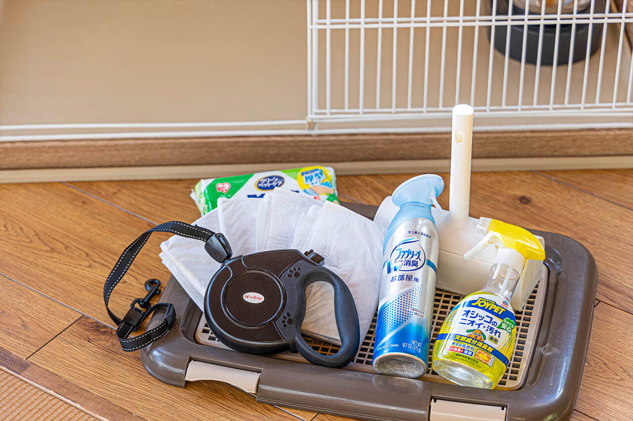 愛犬用の備品であるケージ、トイレ、トイレシート、クッション、粘着シート、トイレットペーパー、ウェットシート、ごみ箱、消臭スプレー、タオル等、充実のご用意ですので、ご準備不要でお越しいただけます。