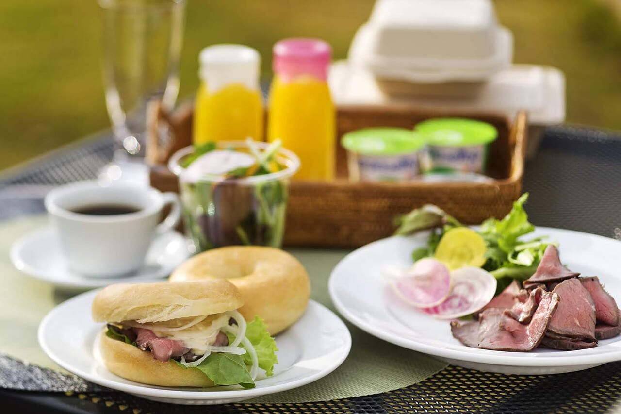 新鮮野菜のサラダ、ローストビーフサンド、ヨーグルト、フルーツジュース