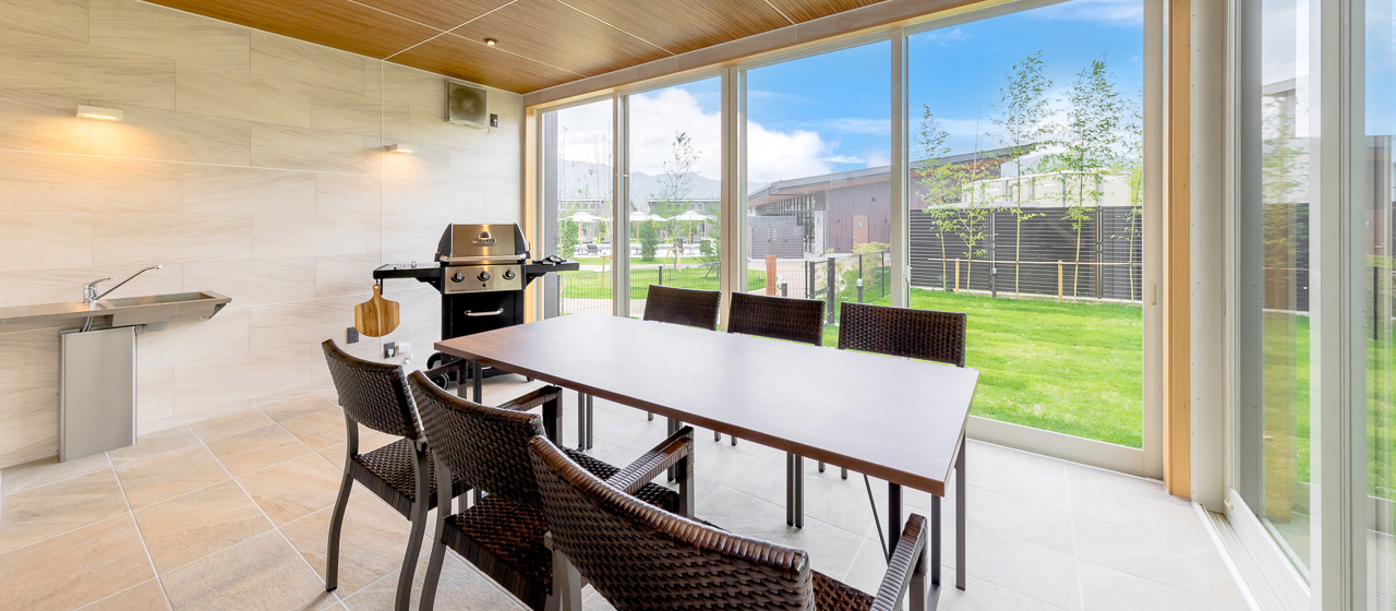 全てのお部屋に全天候に対応できる食事スペースを完備しており、BBQなどを愛犬とお楽しみいただけます。