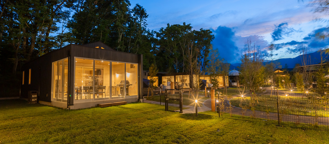 富士山と河口湖の間。全16棟のリゾートヴィラとプライベートキャビン、グランピングテントはいずれも天然温泉風呂とサウナを完備した高規格の完全プライベート空間。