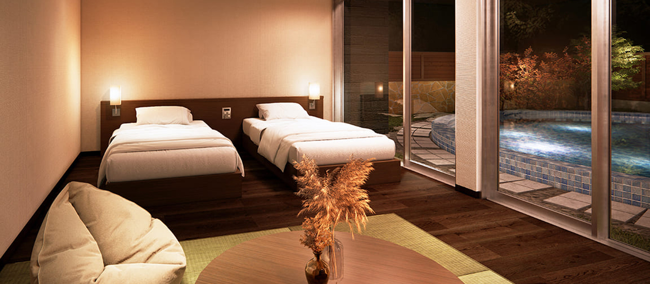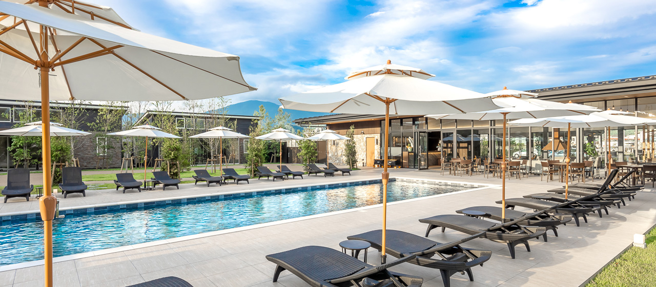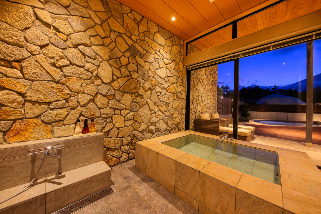 関東初、全棟にプライベートプール・客室温泉・ファイヤーピットを配置したお部屋を楽しむ客室。滞在中はいつでもお好きなタイミングで思い思いにお過ごしいただけます。