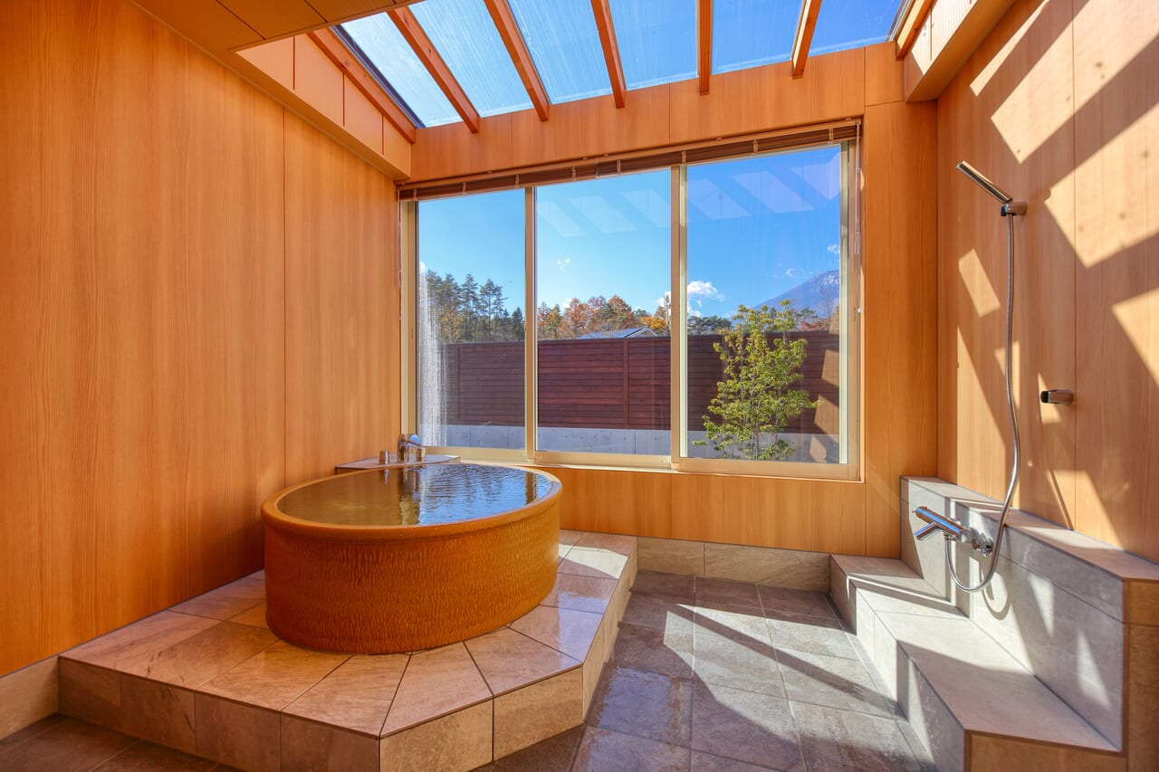 各棟に備えられた天然温泉はゆったりめの浴槽で、気兼ねなくごゆっくりお寛ぎいただけます。