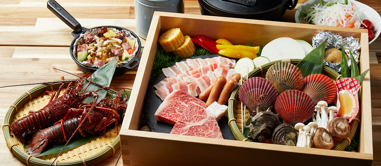 三重伊勢エリアの新鮮な海産物をふんだんに使用したグランピングBBQ、三重県の誇る和牛「松阪牛」を中心とした肉盛りグランピングBBQ、解禁シーズンのみ提供可能な伊勢エビグランピングBBQなど選べるお食事をご用意。
