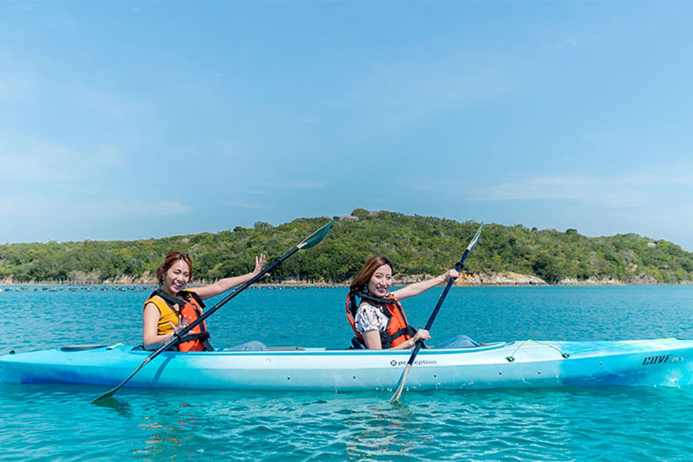伊勢志摩国立公園の真珠が育つ穏やかな英虞湾でカヤックに乗り、大小の島々を周遊♪わんちゃんと一緒にシーカヤックに同乗しお楽しみいただけます。