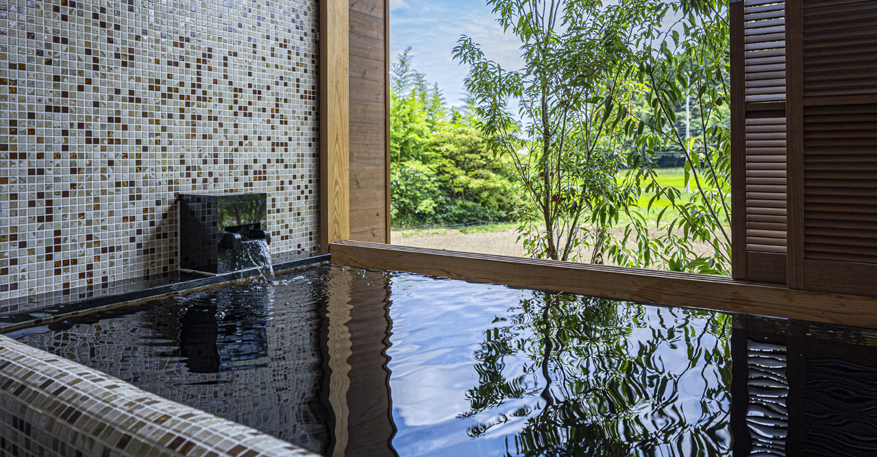 「五氣里-itsukiri-」では各棟の専用風呂で天然温泉をお楽しみいただけます。お好きなタイミングで何度でも、効能豊かな天然温泉に憩う湯あみのひとときを心ゆくまでご堪能ください。