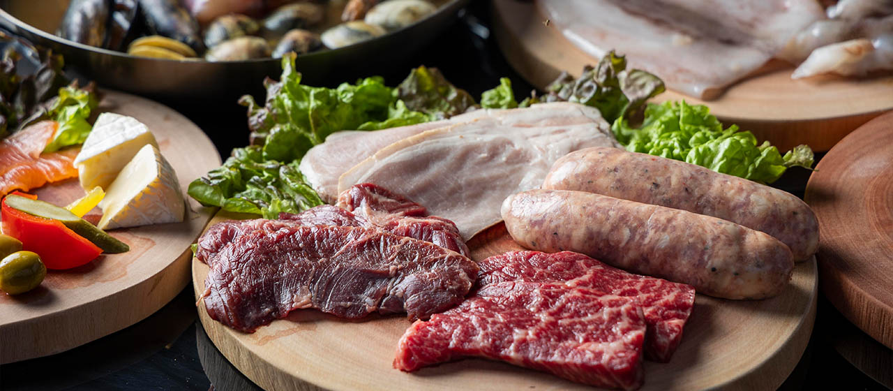 ソーセージ、黒毛和牛100%ハンバーグ、お野菜