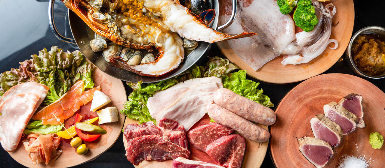 前菜の盛り合わせ、三重県産カツオの藁焼き、土佐あか牛、特選ハラミ、愛知県産ローストポーク、生ソーセージ、北海道産仔羊のロースト、産直野菜のバーニャカウダー、伊勢海老のブイヤーベース、焼きおにぎり、チーズリゾット、自家製バスクチーズケーキ