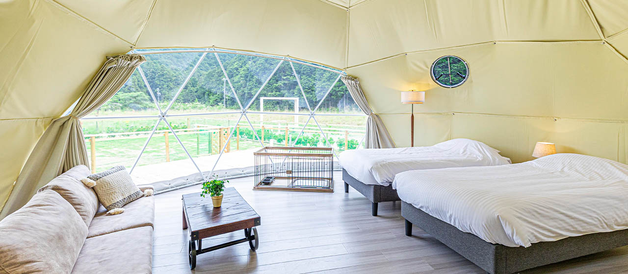お部屋はヴィラタイプを2棟、ドームテントを2棟ご用意しており、それぞれ1棟ずつは愛犬同伴可能となっております。
