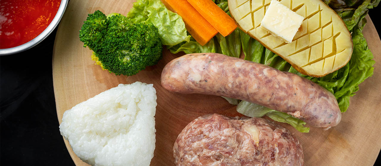ソーセージ、黒毛和牛100%ハンバーグ、お野菜