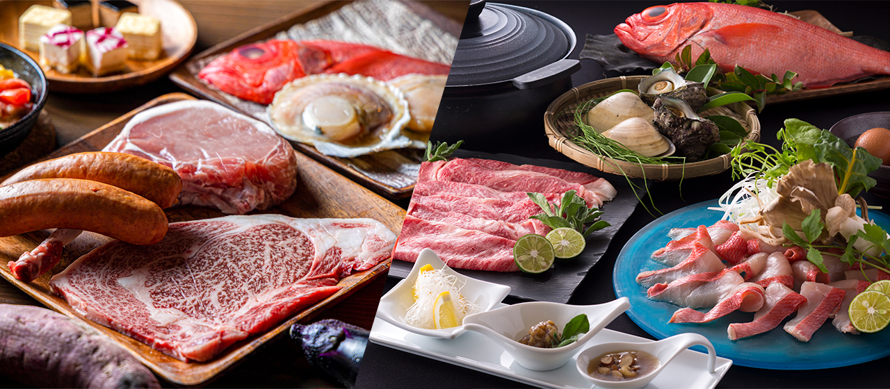 千葉県産かずさ和牛のステーキ、国産豚リブトマホークのハーブスパイス仕立て、房総産金目鯛のグリル、千葉県産旬の海鮮浜焼き、カマンベールチーズのチーズフォンデュ、トマトベースのラタトゥイユ、新鮮野菜のサラダ、デザート、バケット