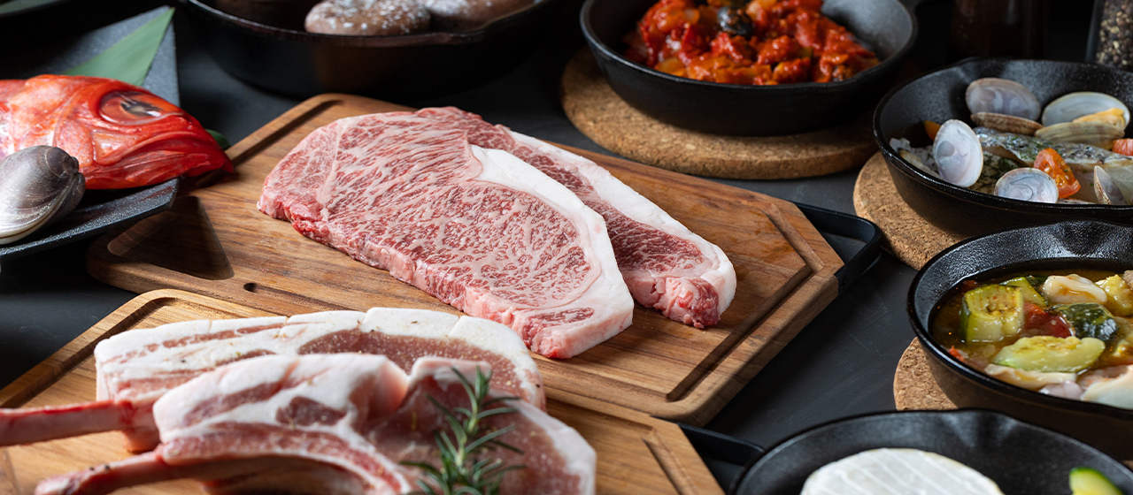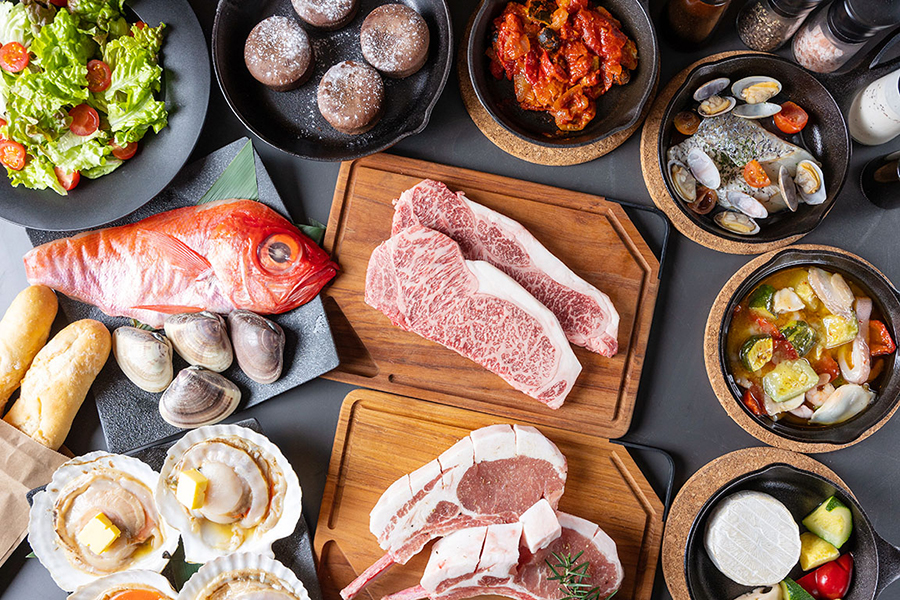 千葉県産かずさ和牛のステーキ、国産豚リブトマホークのハーブスパイス仕立て、房総産金目鯛のグリル、千葉県産旬の海鮮浜焼き、カマンベールチーズのチーズフォンデュ、トマトベースのラタトゥイユ、新鮮野菜のサラダ、デザート、バケット